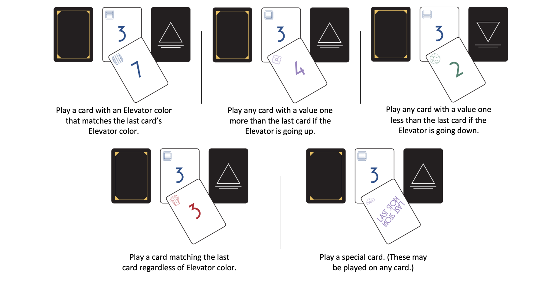 Players take turns strategically playing cards from their hands in an attempt to keep the "Elevator" between floors 1 and 99. The Elevator starts on floor 1 going up. Each numbered card that's played adds its numbered value to the Elevator. However, players can also flip the Elevator's direction to going down, at which point numbered cards subtract their value from the Elevator.