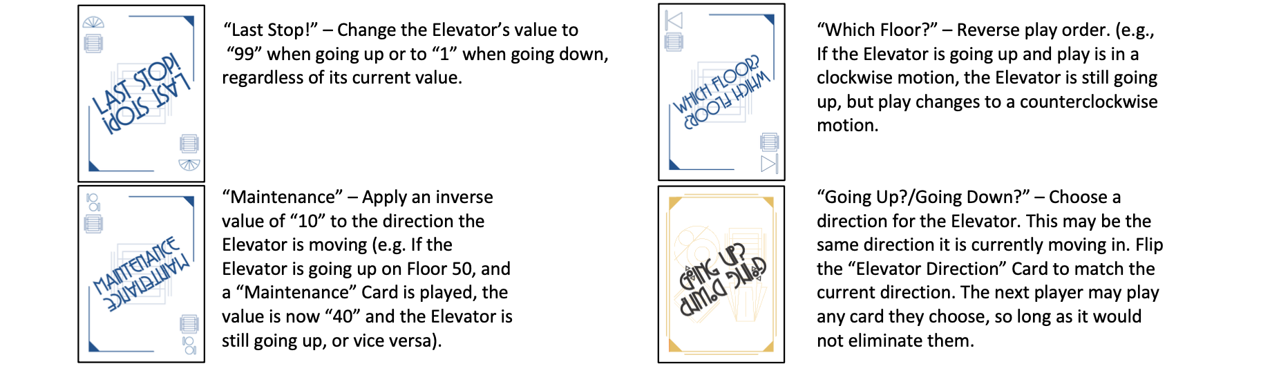 Going Up? An Elevator Card Game is a casual party game combining elements of games like "99" and "Uno" in which players takes turns playing a card from their hand to move the "Elevator" a set number of floors, based on the value of the card. If a player can’t play a card without moving the elevator below the 1st floor or above the 99th, they’re out. The last player standing wins!